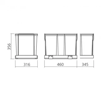 Dieser Küchen-Mülltrennsystem wurde entwickelt, um im Alltag maximale Praktikabilität zu bieten. Sein Auszugssystem ermöglicht es, beim Öffnen des Schranks alle Behälter leicht herauszuziehen und erleichtert so die Mülltrennung. Der Mülleimer ist je nach gewähltem Modell mit 2 oder 3 Behältern ausgestattet und bietet ein Gesamtvolumen von 32L oder 34L. Die großen Behälter werden mit Deckeln für optimale Hygiene geliefert. Dank seiner kompakten Abmessungen (Höhe 356mm, Tiefe 460mm) passt dieser Mülleimer perfekt in einen Schrank von mindestens 450mm.