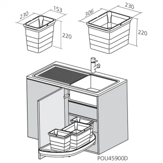 Die Abfallentsorgung in einer Küche kann schnell zu einem Puzzle werden, besonders wenn der Platz begrenzt ist. Hier kommt unser Mülltrennsystem für Eckunterschränke ins Spiel. Dieses ausgeklügelte System optimiert einen oft ungenutzten Raum in der Küche: die Ecke der Unterschränke. Mit einer Höhe von nur 333 mm passt dieses Set perfekt in Schränke mit einer Mindesttiefe von 450 mm und einer Breite von 900 mm und bietet somit eine diskrete und effiziente Lösung zur Mülltrennung.