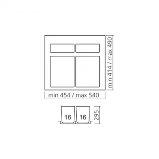 Dieser Mülleimer zeichnet sich durch sein intelligentes und modulares Design aus. Der zuschneidbare Sockel passt sich präzise an die Abmessungen Ihrer Schublade an und garantiert eine maßgeschneiderte Installation. Die flexiblen Abmessungen (Breite 454 bis 540mm und Tiefe 414 bis 490mm) gewährleisten Kompatibilität mit einer breiten Palette von Küchenmöbeln. Mit einer Höhe von 295mm nutzt er den verfügbaren Platz in Ihrer Schublade effektiv.