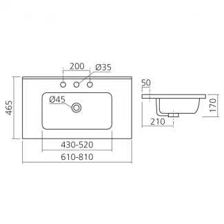 Die Vielseitigkeit unseres einfachen Waschbeckens ist ein weiterer großer Vorteil. Es ist mit Möbeln verschiedener Größen (460x600 mm oder 460x800 mm) kompatibel und passt sich so verschiedenen Badezimmerkonfigurationen an. Egal ob Sie über einen begrenzten oder großzügigeren Raum verfügen, dieses Einbauwaschbecken wird seinen Platz finden und Ihrem Interieur einen Hauch von Eleganz verleihen.