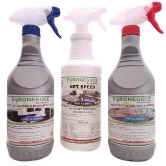 The Euronégoce Sanitary Descaling Cleaner and the Euronégoce Modern Surfaces and Windows Cleaner are packaged in 750 mL bottles, and the Euronégoce Net Speed Multi-Purpose Cleaner comes in a 1 L format. You will therefore have the possibility to carry out numerous applications on your surfaces to be treated.