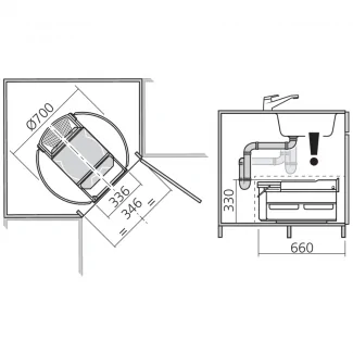 The Rondo kitchen trash can stands out with its unique rotary system, perfectly adapted to corner cabinets. This pivoting mechanism allows easy access to all compartments, thus optimizing the use of often poorly exploited corner space. With dimensions of 330 mm in height, 692 mm in width, and 660 mm in depth, it fits perfectly into a standard corner cabinet or under a sink.