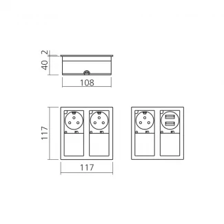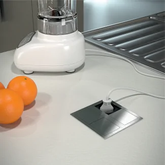 La instalación del bloque de enchufes empotrable es relativamente sencilla, requiriendo únicamente un corte de 108x108 mm en su superficie de trabajo. Se recomienda recurrir a un electricista cualificado para garantizar una instalación conforme a las normas de seguridad eléctrica vigentes. El mantenimiento se limita a una limpieza regular de las superficies y las tapas deslizantes, asegurándose de mantener los enchufes limpios y secos para preservar su eficacia y durabilidad.