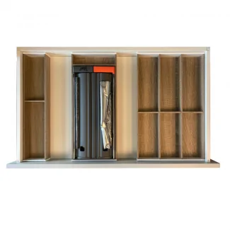 El juego organizador de cubiertos AMBIA-LINE es la solución ideal para optimizar la organización de sus cajones de cocina. Compatible con los cajones LÉGRABOX y MERIVOBOX de alturas M y K, este sistema modular se adapta perfectamente a las guías de 500 mm. Con un ancho mínimo de 900 mm, incluye un práctico dispensador, un espacioso organizador de cubiertos, así como dos marcos de diferentes anchos para una máxima flexibilidad. Simplifique su día a día y gane en eficiencia gracias a este ingenioso sistema de organización.