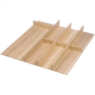 El diseño inteligente de este organizador de cubiertos para cajón integra varios compartimentos separados por divisiones fijas. La madera utilizada presenta una elegante veta natural y un acabado cuidado que armoniza con el interior de sus cajones. Las dimensiones precisas de 470 x 57 mm garantizan un uso óptimo del espacio disponible.