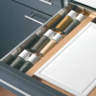 La integración de este soporte para especias en tu cajón es simple y no requiere ninguna herramienta especial. Basta con posicionarlo en el cajón TANDEMBOX para crear instantáneamente un espacio de almacenamiento organizado. En el día a día, el acceso a las especias se vuelve más práctico gracias a: