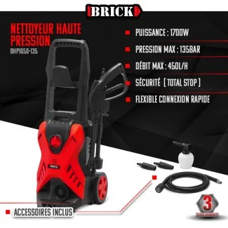 La hidrolimpiadora Brick 1700W es un aparato potente y versátil, ideal para sus trabajos de limpieza exterior. Con una potencia de 1700 vatios y una presión máxima de 135 bares, ofrece un excelente rendimiento para eliminar eficazmente la suciedad más resistente. Su robusto motor le permite generar un importante caudal de agua para una limpieza rápida y profunda.