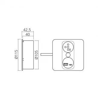 Conçu pour s'intégrer parfaitement dans l'épaisseur de votre plan de travail avec un diamètre de perçage de 105 mm, ce bloc compact de 115 x 115 x 42,5 mm offre une solution de connexion discrète. Son câble d'alimentation de 2 mètres permet une installation flexible selon vos besoins.