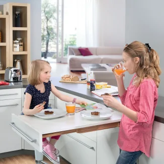 Cette solution d'aménagement s'avère particulièrement pertinente pour les cuisines compactes. Son système d'extension permet de disposer d'un plan de travail conséquent uniquement lorsque nécessaire, optimisant ainsi l'utilisation de l'espace disponible. La table se range discrètement dans le meuble lorsqu'elle n'est pas utilisée, libérant un espace précieux pour la circulation.