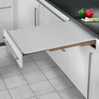 Cette table coulissante représente une innovation majeure dans l'aménagement de cuisine. Conçue pour s'intégrer parfaitement dans un meuble de 600 mm, elle dispose d'un système d'extension unique. Les coulisses en bois de haute qualité permettent une sortie impressionnante de 800 mm tout en conservant un encombrement minimal de 490 mm en position repliée. Le plateau en stratifié assure une résistance optimale aux chocs et aux rayures.
