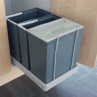 Cette poubelle de cuisine tri sélectif a été conçue pour offrir un maximum de praticité au quotidien. Son système coulissant permet d'extraire facilement l'ensemble des bacs à l'ouverture du meuble, facilitant ainsi le tri des déchets. La poubelle est équipée de 2 ou 3 bacs selon le modèle choisi, offrant une capacité totale de 32L ou 34L. Les grands bacs sont livrés avec des couvercles pour une hygiène optimale. Grâce à ses dimensions compactes (hauteur 356mm, profondeur 460mm), cette poubelle s'intègre parfaitement dans un caisson de 450mm minimum.