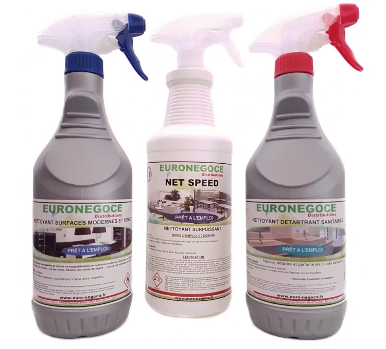 Le Nettoyant Détartrant Sanitaires Euronégoce et le Nettoyant Surfaces Modernes et Vitres Euronégoce sont conditionnés en bouteille de 750 mL, et le Nettoyant Multi Usage Net Speed Euronégoce se présente en format 1 L. Vous aurez donc la possibilité de réaliser de très nombreuses applications sur vos surfaces à traiter.