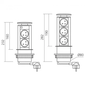 L'installazione di questo blocco presa a scomparsa è semplice e rapida. Basta realizzare un foro di 82mm di diametro nel piano di lavoro per incassarlo. Il blocco viene poi fissato saldamente grazie a un anello da avvitare sotto il piano, assicurando un fissaggio stabile e duraturo. Questo metodo di installazione permette di ottenere un risultato pulito e professionale, senza rischio di movimento o dislocamento del blocco presa. La lunghezza totale di 282mm offre un'altezza sufficiente per adattarsi alla maggior parte degli spessori dei piani di lavoro.