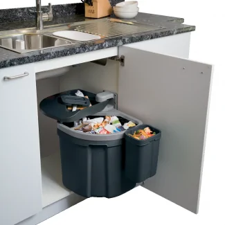 Il cestino girevole EUROFLEXX è stato progettato per integrarsi armoniosamente nella vostra cucina. Il suo design sobrio e moderno, con la finitura in PVC grigio, si adatta a una varietà di stili di cucina, sia contemporanei che più classici. L'installazione discreta in un mobile permette di mantenere un'estetica pulita nella vostra cucina, pur avendo una soluzione efficace per la gestione dei rifiuti a portata di mano. Il coperchio fisso, oltre alla sua funzione pratica, contribuisce all'aspetto estetico nascondendo i rifiuti e offrendo una superficie aggiuntiva utile nel vostro spazio di lavoro.