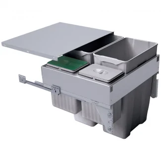 L'installazione di questo cestino per la raccolta differenziata è semplice e rapida. Il telaio scorrevole si fissa facilmente ai lati del mobile e alla facciata dell'anta, assicurando una stabilità ottimale. Il coperchio fisso non solo nasconde i rifiuti, ma offre anche una superficie aggiuntiva per posare gli accessori da cucina, massimizzando così l'utilizzo dello spazio disponibile. I contenitori in plastica grigia sono durevoli e facili da pulire, garantendo una perfetta igiene del vostro spazio di raccolta.